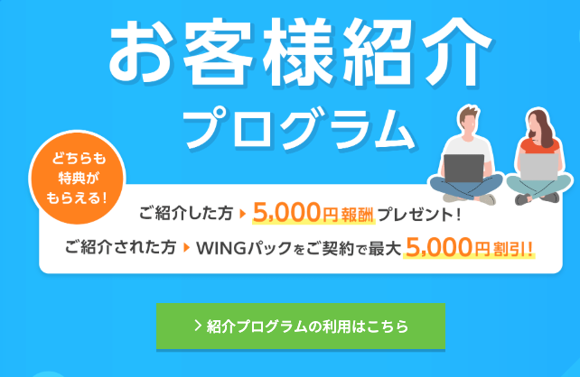 代表的なのが「お客様紹介プログラム」です。既存ユーザーの紹介リンクから申し込むと5,000円割引が適用されます。WINGパック12ヶ月以上の契約が条件で、公式キャンペーンとの併用も可能です。キャンペーン割引と合わせると月額500円台での契約も十分に狙えます。
